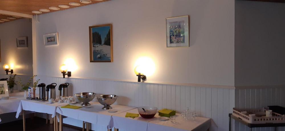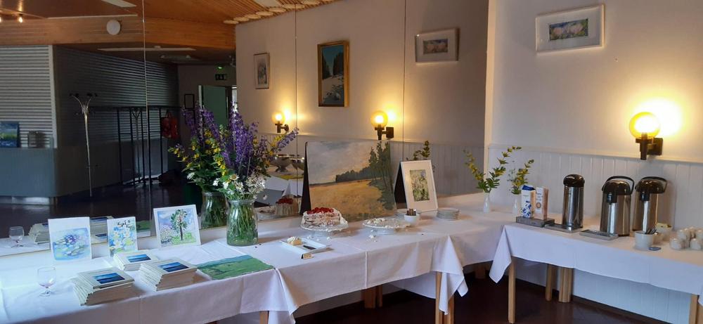 Hotelli oli pannut parastaan leipomalla hyvän mansikkakakun ja sekoittamalla herkullisen boolin. Lisäksi tarjolla oli grillimestari Samin tarjoilemia makkaroita. Osa aloitti ruokailun makkaroista ja osa kakkukahveilla. Kahvittelun lomassa Sanna esitteli alueen taiteilijoiden töitä. Henry Kahrila on maalannut öljyvärein vuosikymmenten aikana paljon Nuuksion maisemia kaikkina vuodenaikoina. Henry ei itse päässyt tilaisuuteen helteen takia. Nyt esillä olleet työt esittivät talvimaisemaa sähkölinjoineen ja peltomaisemaa kyntäjineen hevosen kanssa.